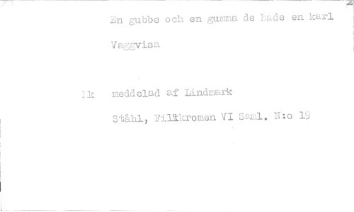 //// En gubbe och en gumma de hade en karl Vaggvisa //// meddelad af Lindmark //// Ståhly 2iltkromen VI Sal. N:o 19 ////