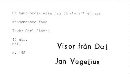 //// En hemgjorder visa jag tänkte att sjunga Köpmannebrovisan //// Text: Carl Stahre //// 15 str. //// mel. Visor från Dal, //// s. 158 //// Jan Vegetius ////