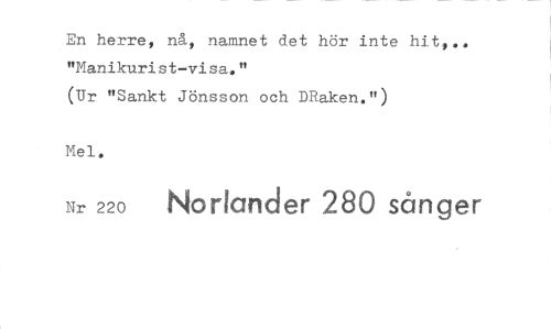 //// En herre, nå, namnet det hör inte hit,.. "Manikurist-visa." //// (Ur "Sankt Jönsson och DRaken.") //// Mel. //// Nr 220 Norlander 280 sånger ////