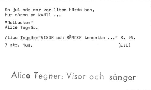 //// En jul när mor var liten hörde hon, hur någon en kväll ... //// "Julbocken" Alice Tegnér. //// Alice TecIndr:"VISOR och SANGER tonsatta ..." S. 55. 3 str. Mus. (E:1) //// Alice Tegner: Visor oc sånger ////