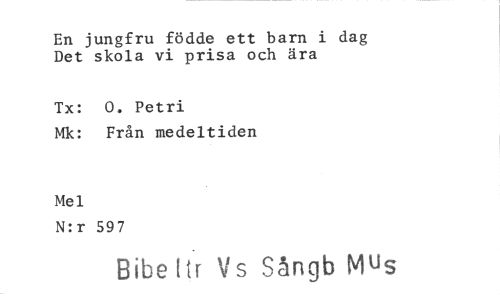 //// En jungfru födde ett barn i dag Det skola vi prisa och ära //// Tx: 0. Petri //// Mk: Från medeltiden //// Mel //// N:r 597 //// Bibe lir V s Sångb Mus ////
