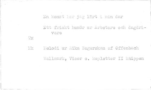 //// n konst 1-- jag lärt i ._ugn dar //// 1,-;tt friskt humör ur Arbetare och dagdrivare //// x //// Lk elodi ur rika Bagerskan af Offenbach //// Wallmark, Visor o. kupletter II knippen ////