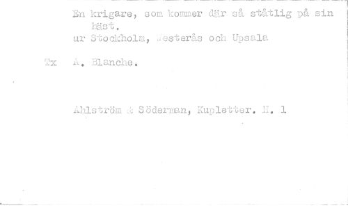 //// :Sn krigare, som kommer där så ståtlig på sin häst. //// ur Stockholm, Jesterås och Upsala //// Blanche. //// hlström ,J,J Söderman, Kupletter. E. 1 ////