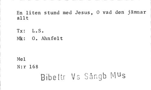 //// En liten stund med Jesus, 0 vad den jämnar allt //// Tx: L.S. //// Mk: 0. Ahnfelt //// Mel //// N:r 168 //// Bibeltr ids Sångb Mus ////