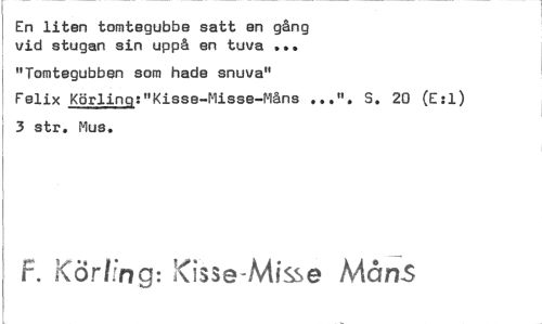 //// En liten tomtegubbe satt en gång vid stugan sin uppå en tuva ... //// "Tomtegubben som hade snuva" //// Felix Körling:"Kisse-Misse-Måns ...". 9. 20 (E:1) 3 str. Mus. //// F. Kör-Ung: Kisse-Misse Måns ////