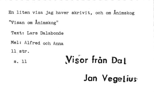 //// En liten visa jag haver skrivit, och om Ånimskog "Visan om Ånimskog" //// Text: Lars Dalabonde //// Mel: Alfred och Anna 11 str. //// s. 11 yisror från Dat //// Jan Vegetlu; ////
