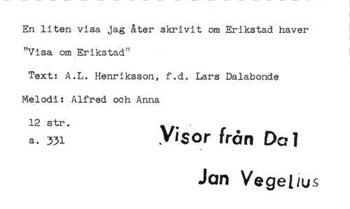 //// En liten visa jag åter skrivit om Erikstad haver "Visa om Erikstad" //// Text: A.L. Henriksson, f.d. Lars Dalabonde Melodi: Alfred och Anna //// 12 str. s. 331 Visor från Dal //// Jan Vegelius ////