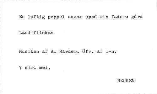 //// En luftig poppel susar uppå min faders gård. Landtflickan //// Musiken af A. Harder. Öfv. af I-n. 7 str. mel. //// NECKEN ////