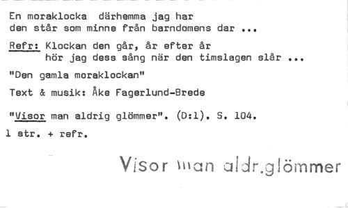 //// En moraklocka därhemma jag har //// den står som minne från barndomens dar //// Refr: Klockan den går, år efter år //// hör jag dess sång när den timslagen slår ... //// "Den gamla moraklockan" //// Text & musik: Åke Fagerlund-Brede //// "Visor man aldrig glömmer". (D:1). S. 104. 1 ett.. refr. //// Visor \Han aldr.giömmer ////