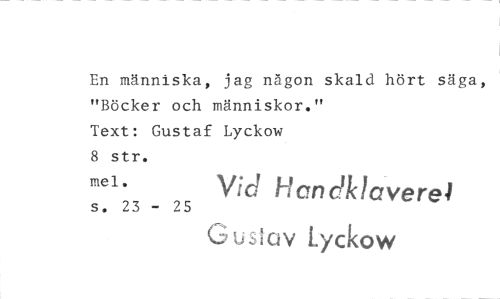 //// En människa, jag någon skald hört säga, "Böcker och människor." //// Text: Gustaf Lyckow //// 8 str. //// mel. Vid Han c-Iklaverel //// G us Gv Lyckow //// s. 23 - 25 ////