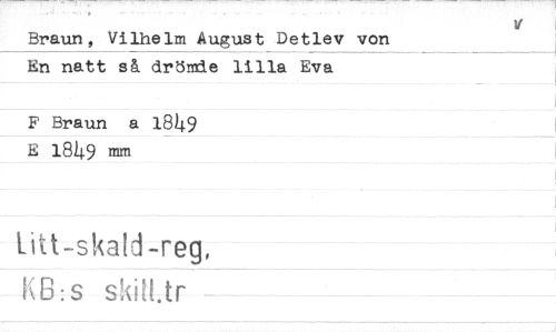 //// Braun, Vilhelm August Detlev von En natt så drömde lilla Eva //// F Braun a 1849 E 1849 mm //// litt-skald-reg, //// KB: s skitiAr ////