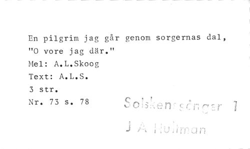 //// En pilgrim jag går genom sorgernas dal, "0 vore jag där." //// Mel: A.L.Skoog //// Text: A.L.S. //// 3 str. //// Nr. 73 s. 78 Scen //// LY j i" ri n ////