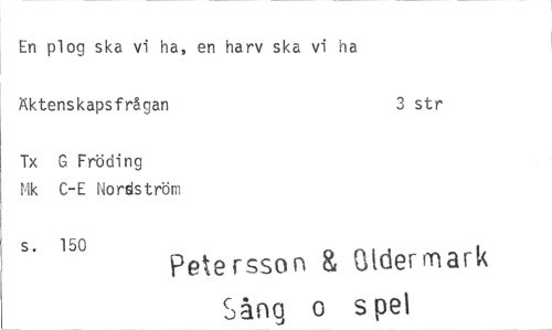 //// En plog ska vi ha, en harv ska vi ha //// Äktenskapsfrågan 3 str //// Tx G Fröding //// £4k C-E Nordström //// s. 150 Petersson 8 Ulderrnark //// Sång o spel ////