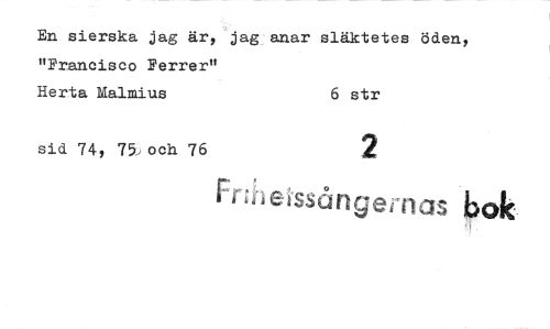 //// En sierska jag är, jag, anar släktetes öden, "Francisco Ferrer" //// Herta Malmius 6 str //// sid 74, 75) och 76 //// Frdieissångernas hok ////