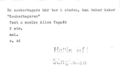 //// En sockerbagare här bor i staden, han bakar kakor "Sockerbagaren" //// Text o musik: Alice Tegnér //// 2 str. //// mel. //// s. 46 //// Hn'r;n r //// n ; ////
