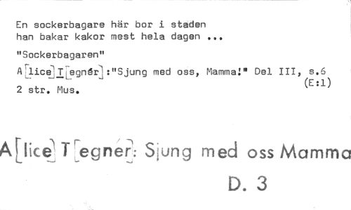 //// En sockerbagare här bor i staden han bakar kakor mest hela dagen //// "Sockerbagaren" //// A7licjT7egnår-1,:"Sjung med oss, Mamma:" Del III, 5.6 //// j //// 2 str. Mus. (E:1) //// Alliceregne7: Sjung med oss Mamma //// D. 3 //// • • • ////