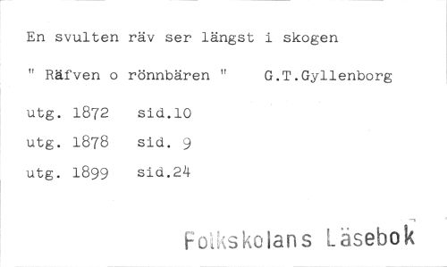 //// En svulten räv ser längst i skogen //// " Räfven o rönnbären G.T.Gyllenborg //// utg. 1872 sid.10 //// utg. 1878 sid. 9 //// utg. 1899 sid.24 //// Fc,,skolans Läsebok ////