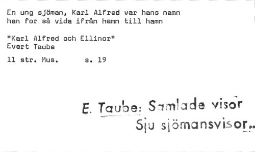 //// En ung sjöman, Karl Alfred var hans namn han for så vida ifrån hamn till hamn //// "Karl Alfred och Ellinor" Evert Taube //// 11 str. Mus. s. 19 //// E. Taube: Sirn,Jde visor' //// Sju siörnansvisor.. ////