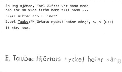 //// En ung sjöman, Karl Alfred var hans namn han for så vida ifrån hamn till hamn ... //// "Karl Alfred och Ellinor" //// Evert Taube:"Hjärtats nyckel heter sång", s. 9 (E:1) 11 str4 Mus. //// E. Taube: Hjärtats nyckel heter sån.L., ////