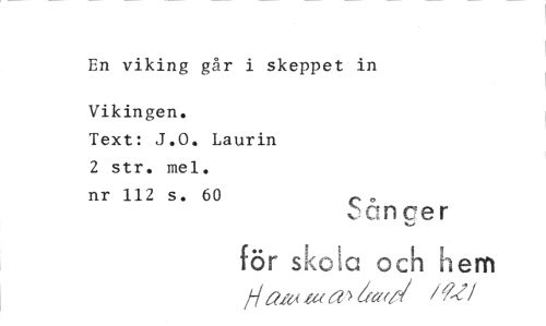 //// En viking går i skeppet in //// Vikingen. //// Text: J.O. Laurin 2 str. mel. //// nr 112 s. 60 Sånger //// för skola och hem //// f/ ab( be ad /9.z //// /