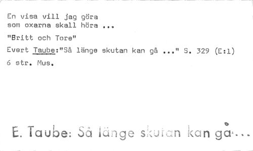 //// En visa vill jag göra //// som oxarna skall höra ... //// "Britt och Tore" //// Evert Taube:"Så länge skutan kan gå ..." S. 329 (E:1) 6 str. Mus. //// E. Taube: Så unge s ul,:n kan ga... ////