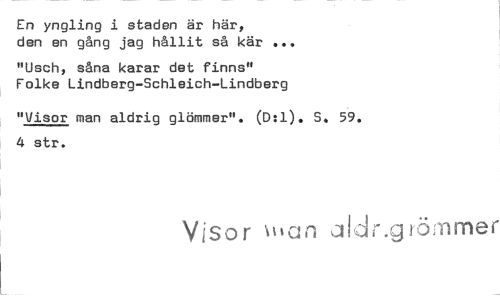//// En yngling i staden är här, //// den en gång jag hållit så kär ... //// "Usch, såna karar det finns" Folke Lindberg-Schleich-Lindberg //// "Visor man aldrig glömmer". (D:1). S. 59. 4 str. //// Visor ‘klain Jidr.grÖMMer ////