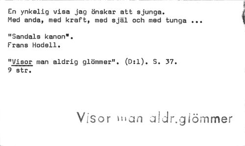//// En ynkelig visa jag önskar att sjunga. //// Med anda, med kraft, med själ och med tunga ... //// "Sandals kanon". Frans Hodell. //// "Visor man aldrig glömmer". (D:1). S. 37. 9 str. //// Visor Ilian Idr,ömmer ////