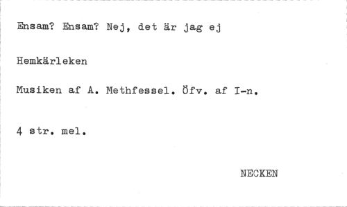 //// Ensam? Ensam? Nej, det är jag ej //// Hemkärleken //// Musiken af A. Methfessel. öfv. af I-n. //// 4 str. inel. //// NECKEN ////