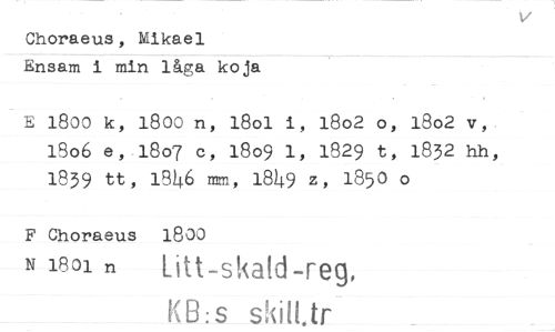 //// Choraeus, Mikael Ensam i min låga koja //// E 1800 k, 1800 n, 18o1 i, 18o2 o, 18o2 v, 1806 e,-1807 c, 18o9 1, 1829 t, 1832 hh, //// 1839 tt, 1846 mm, 1849 z, 1850 o //// F Choraeus 1800 //// N 18 01 n [At-skald-regi //// KB:s skilt tr ////