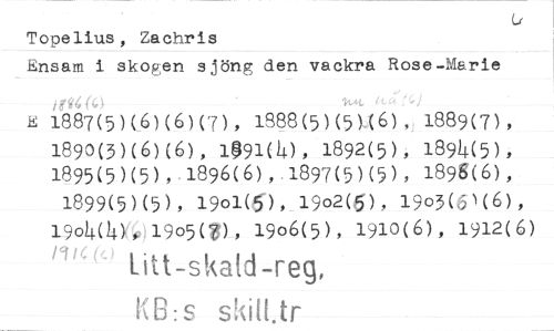 //// Topelius, Zachris //// Ensam i skogen sjöng den vackra Rose-Marie //// E 1887(5)(6)(6)(7), 1888(5)(5)(6), 1889(7), //// 1893(3)(6)(6), 1991(4), 1892(5), 1894(5), //// 1895(5)(5), 1896(6), 1897(5)(5), 1896(6), //// 1899(5)(5), 1901(5), 19o2(6), 19o5(5)(6), //// 1904(4), 1905(8), 1906(5), 1910(6), 1912(6) //// /114' litt-skatd-reg, //// KB:s ////