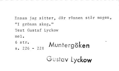 //// Ensam jag sitter, där rönnen står mogen, "I grönan skog." //// Text Gustaf Lyckow //// mel. //// 6 str. //// Muntergöken //// s. 226 - 228 //// Gustav L'yckoW ////