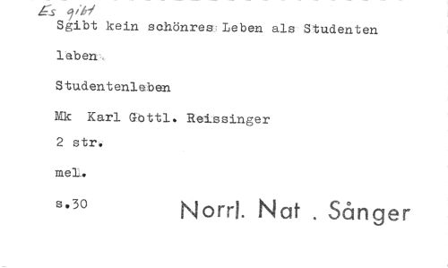 //// gs //// Sgibt kein schönres Leben als Studenten //// Studentenleben //// Mk Karl Gbttl. Reissinger 2 str. //// s.30 Norr!. Nat . Sånger ////