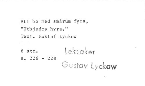 //// Ett bo med smårum fyra, "Utb j udes hyra." //// Text. Gustaf Lyckow //// 6 s tr. Lnksaker //// s. 226 - 228 //// St° V Lyckow ////