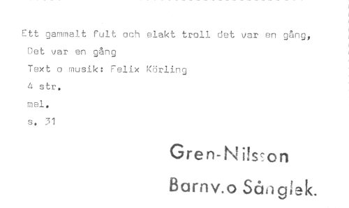 //// Ett gammalt fult och elakt troll det var en gång, Det var en gång //// Text o musik: Felix Körling //// 4 str. //// s. 31 //// Gren-N i!s'on //// Barnv.o Sångek. ////