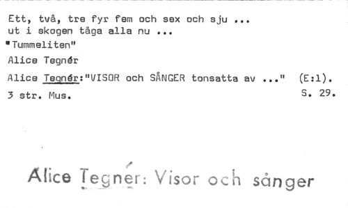 //// Ett, två, tre fyr fem och sex och sju ut i skogen tåga alla nu ... //// *Tummeliten" //// Alice Tegnér //// Alice Tecndr:"VISOR och SÅNGER tonsatta av 3 str. Mus. //// • • • //// •••" (E:1). //// S. 29. //// Alice Tegner: VisorY sånger ////