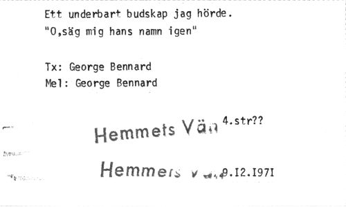 //// Ett underbart budskap jag hörde. "0,säg mig hans namn igen" //// Tx: George Bennard Mel: George Bennard //// Hemmets Vä 4.str?? Hetismer; v .04.12.1971 ////