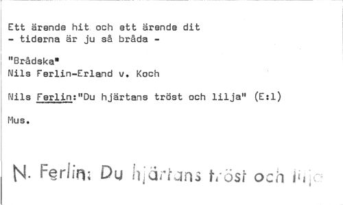 //// Ett ärende hit och ett ärende dit - tiderna är ju så bråda - //// 1 //// "Brådska' //// Nils Ferlin-Erland v. Koch //// Nils Ferlin:"Du hjärtans tröst och lilja" (E:1) //// Mus. //// J. Feriin; Du hjärluns Löst och ////