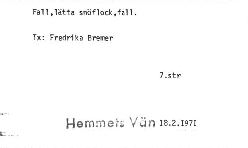 //// Fall,lätta snöflock,fall. //// Tx: Fredrika Bremer //// 7.str //// Hemme x i //// y un 18.2.1971 ////