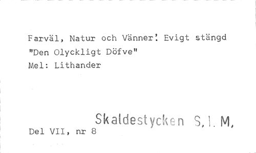 //// Farväl, Natur och Vänner: Evigt stängd "Den Olyckligt Döfve" //// Mel: Lithander //// Del VII, nr 8 Skaldestycken S.1. M, ////