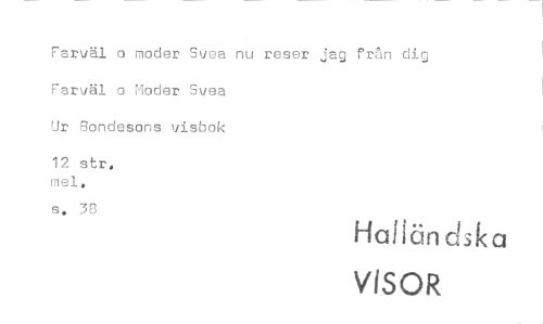 //// Farväl o moder Svea nu reser jag från dig //// Farväl o Moder Svea //// Ur Bondesons visbok //// 12 str. mel. //// s. 30 //// Halkin dika //// VISOR ////