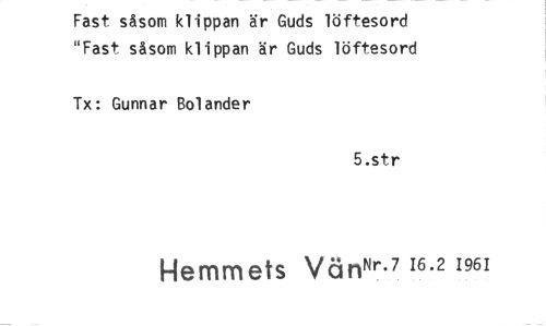 //// Fast såsom klippan är Guds löftesord "Fast såsom klippan är Guds löftesord //// Tx: Gunnar Bolander //// 5.str //// Hemmets Vän Nr.7 16.2 1961 ////