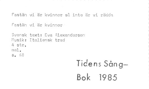 //// Fastän vi är kvinnor så inte är vi rädda Fastän vi är kvinnor //// Svensk text: Eva Alexanderson Musik: Italiensk trad //// 4 str. //// mei. //// s. 68 //// Tidens Sång— //// Bok 1985 ////