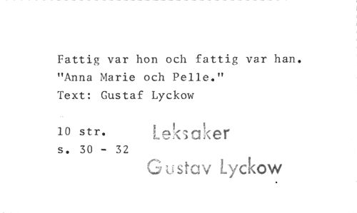 //// Fattig var hon och fattig var han. "Anna Marie och Pelle." //// Text: Gustaf Lyckow //// 10 str. n //// s. 30 - 32 //// Gustav Lyckow ////
