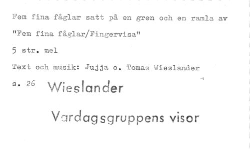 //// Fem fina fåglar satt på en gren och en ramla av "Fem fina fåglar/Fingervisa" //// 5 str. mel //// Text och musik: Jujja o. Tomas Wieslander //// s. 26 Wieslander //// Vgrdagsgruppens visor ////