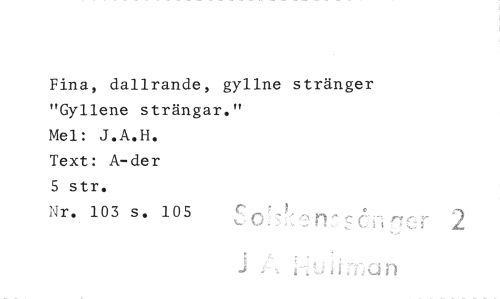 //// Fina, dallrande, gyllne stränger //// "Gyllene strängar." //// Mel: J.A.H. //// Text: A-der //// 5 str. //// Nr. 103 s. 105 2 //// , . //// J n ////