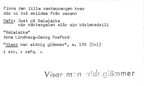 //// Finns den lilla restaurangen kvar där vi två skildes från varann //// Refr: Just på Balalaika //// när näktergalen slår sin kärleksdrill //// "Balalaika" //// Arne Lindberg-Georg Posford //// "Visor; man aldrig glömmer", s. 130 (D:1) 1 str. + refr. //// Visor m7n ltdreg[ömmer ////
