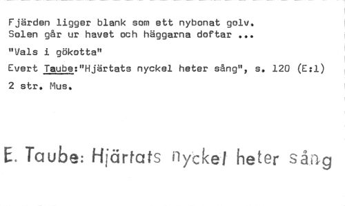 //// Fjärden ligger blank som ett nybonat golv. //// Solen går ur havet och häggarna doftar ... //// "Vals i gökotta" //// Evert Taube:"Hjärtats nyckel heter sång", s. 120 (E:1) 2 str. Mus. //// E. Taube: Hjärtats nyckel heter sång ////