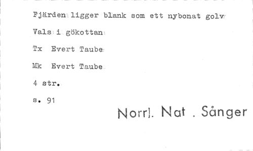 //// Fjärden ligger blank som ett nybonat golv. //// Vals i gökottan. Tx Evert Taube. Mk Evert Taube 4 str. //// s. 91 //// Norr]. Not . Sånger ////