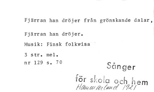 //// Fjärran han dröjer från grönskande dalar, //// Fjärran han dröjer. Musik: Finsk folkvisa 3 str. mel. //// nr 129 s. 70 0 //// .)00n ger //// för jox: och hem //// k/ A« eGf 7b? a' /90n' ////