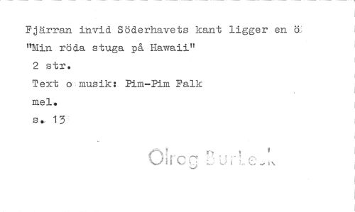 //// Fjärran invid Söderhavets kant ligger en nlin röda stuga på Hawaii" //// 2 str. //// Text o musik: Pim-Pim Falk //// inel. //// s. 13. ////